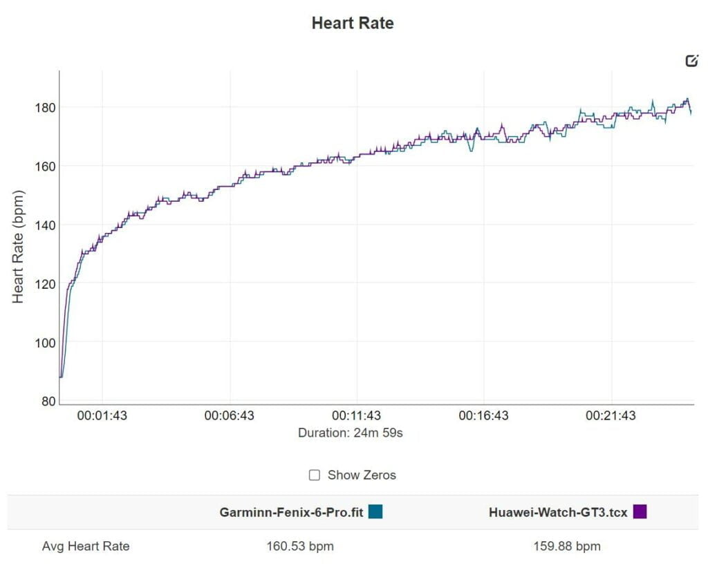 As my speed and heart rate increased so did discrepancies in the accuracy, at one point, the Huawei records 174bp while the Garmin/Polar OH1 reads 168bpm.