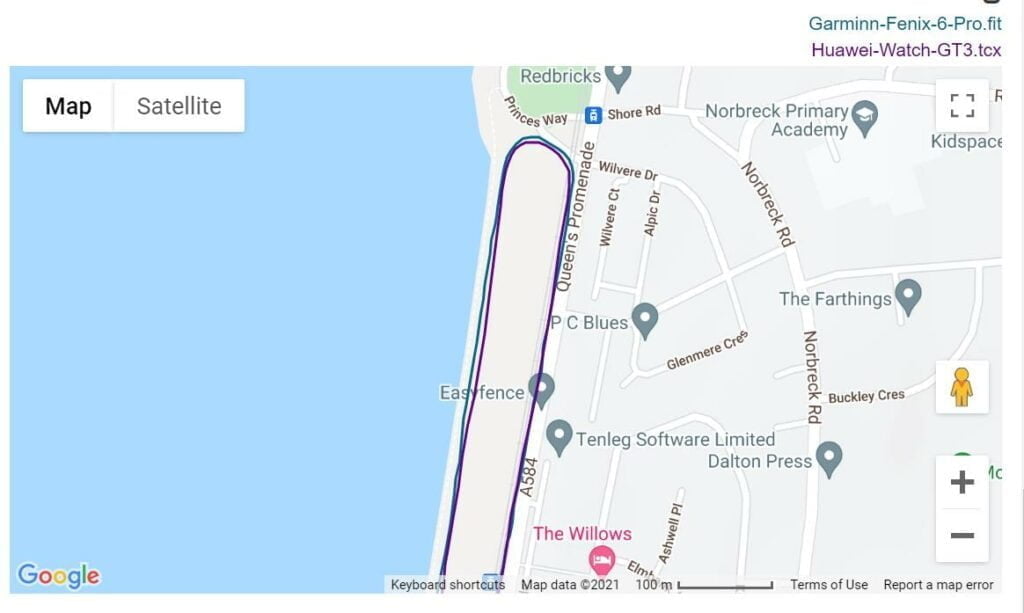 The GPS lock-on time was much faster than the Huawei Watch 3, and the overall accuracy seems to be better too.