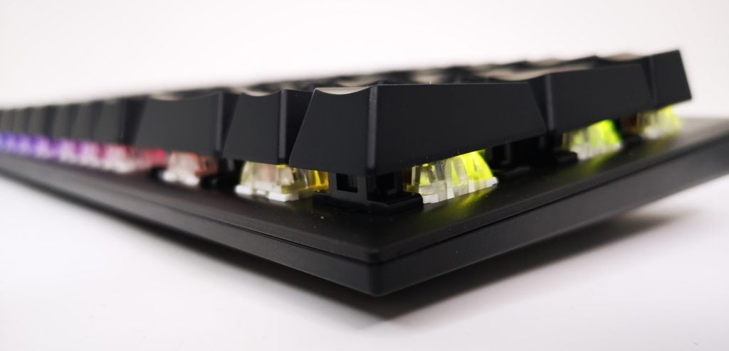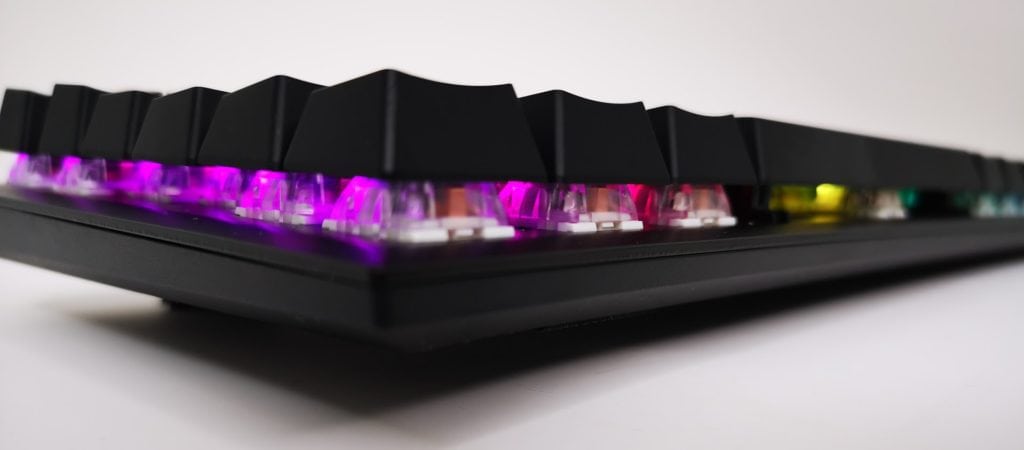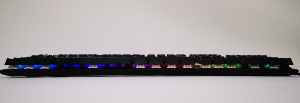 The keyboard will work out of the box like all USB devices nowadays, but as with any other premium RGB peripheral you can download the companion software and customise the settings as much as you like.The default profile is your typical over the top RGB pattern spread across the keyboard, with the keys sitting so high up and the switches exposed I find this a particularly bright keyboard. So much so it hurts my eyes a little. This is made worse by the fact that I use a 42” 4K TV as my primary display and it has a glossy surface, so I get the lights shining against my screen. These are an issue that won’t affect most people, but for me, I had to dial down the settings.