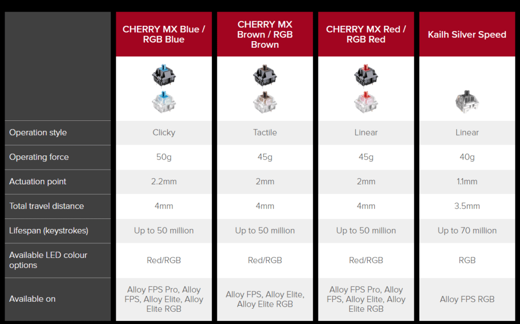 In comparison, the Kailh Silver Speed has a lighter 40g operating force and almost half the actuation point at 1.1mm with a total travel distance of 3.5mm. The tactile and audio feedback is much lower with these, and the feel is more like flat-panel membrane in terms of feel (from what I can remember). However, unlike membrane keyboards, these linear-style key switches are far more responsive and can help reduce response times as much as possible