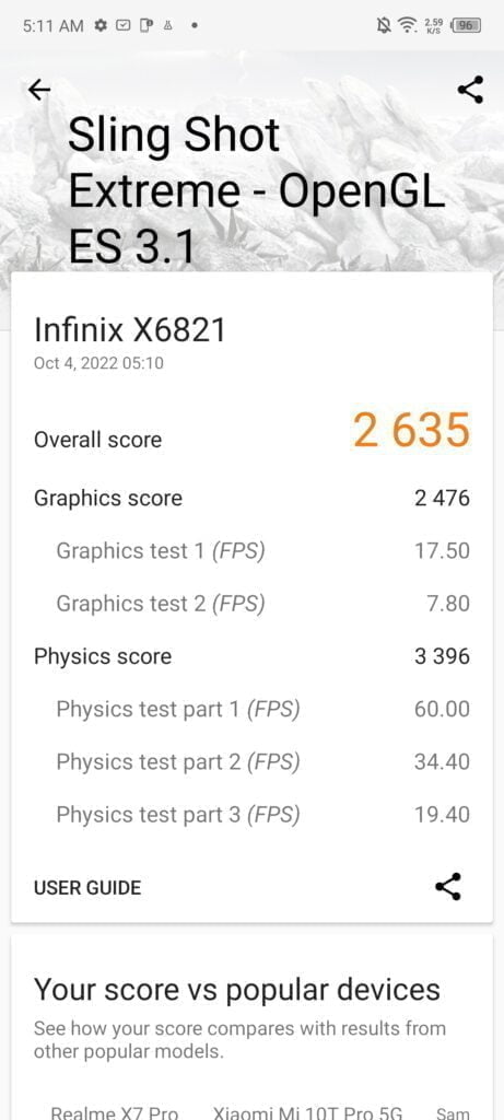 For 3DMark, I tested the Relame 6 with Helio G90T, this was before Wildlife was launched. With Slingshot Extreme OpenGL, it scored 2537, while the Inifinix manages 2635, a 4% improvement.