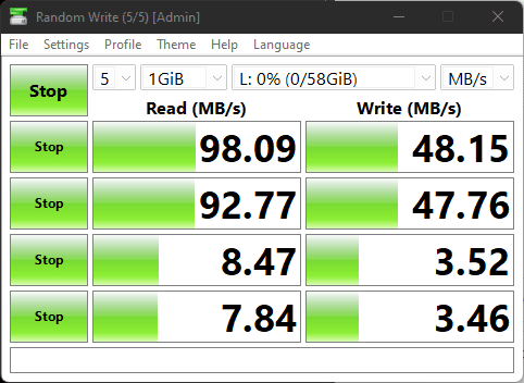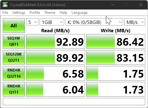 The Kingston Canvas React Plus drive I happened to have on my table during this review achieves speeds of 93MB/s and 86MB/s. Even though it has faster sequential write speeds, it is slower with random read writes.