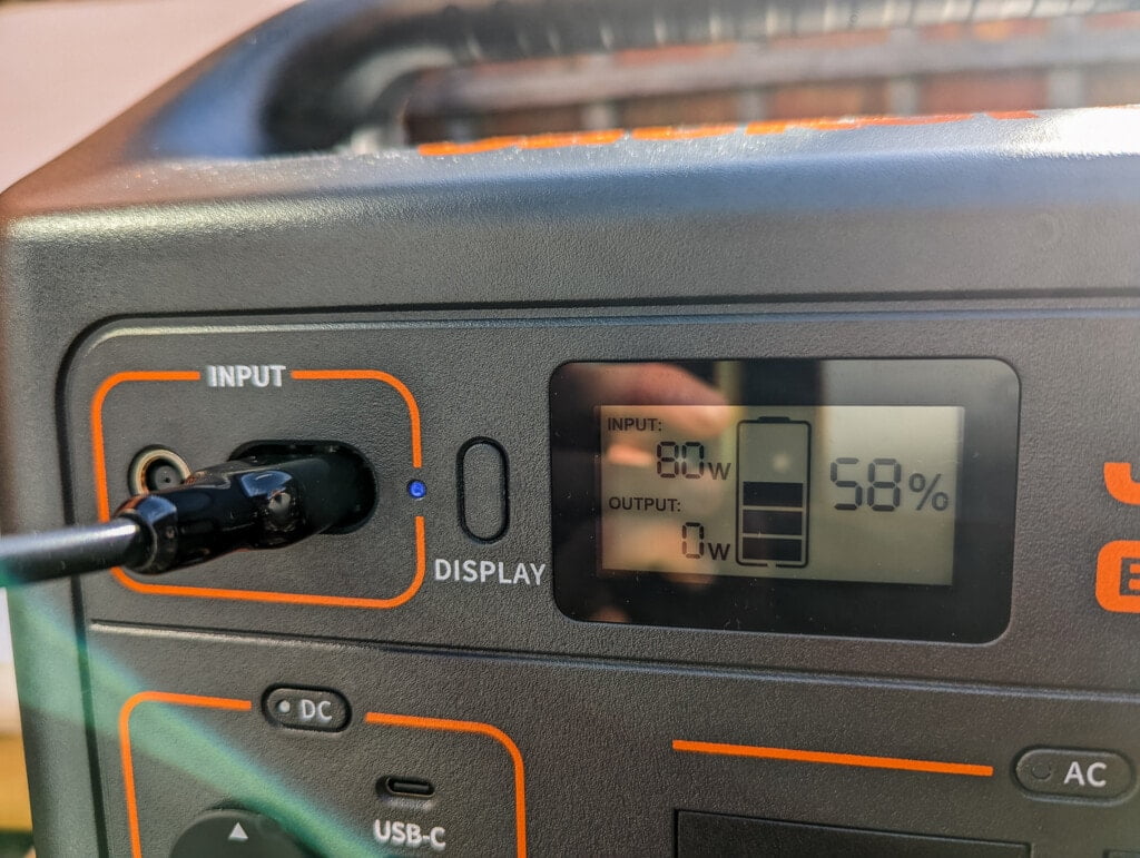 I reviewed the Jackery Solar Generator 500 in October 2021, and I live up north. It was, therefore, not the optimal condition for solar charging. I was lucky to get a few sunny days, and locating the panel on my garage roof, I was able to achieve a peak charge rate of 60W, which I thought was quite good considering the conditions.