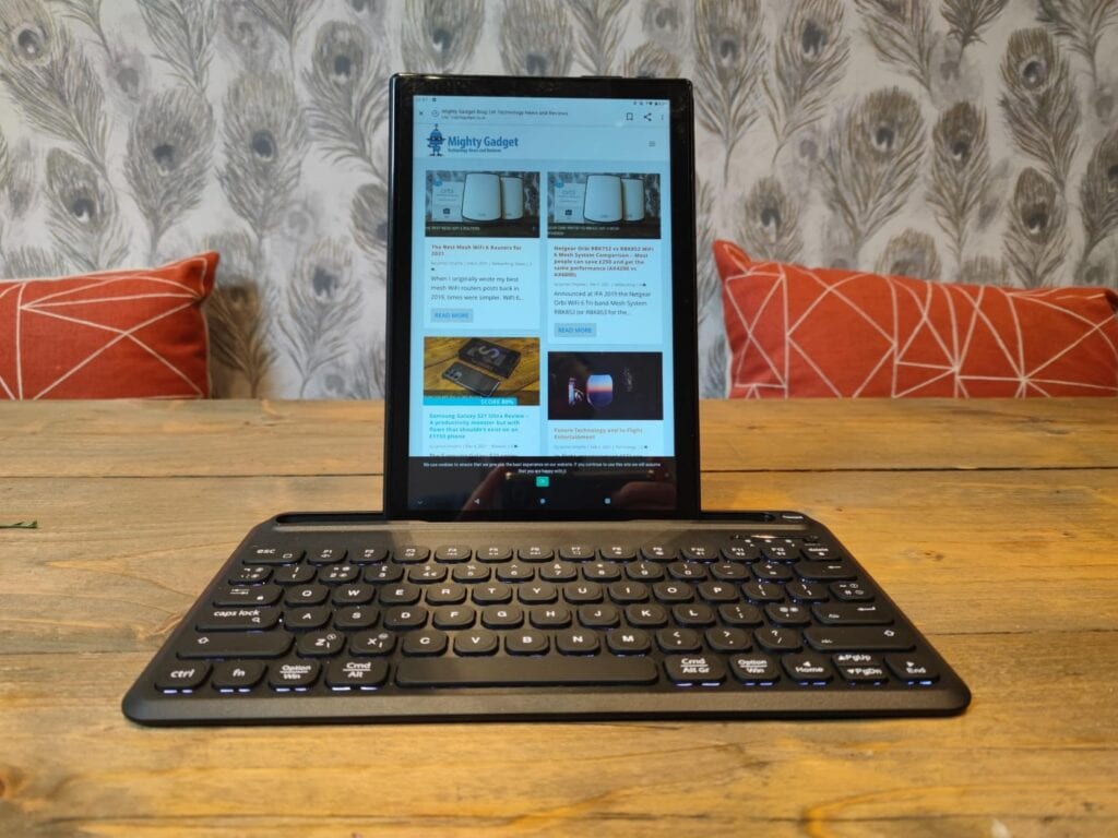 This is a well-sized mini keyboard with a built-in mount that can accommodate devices up to 24.99cm, which should be good enough for tablets a little over 10” (it fits my Teclast M40).