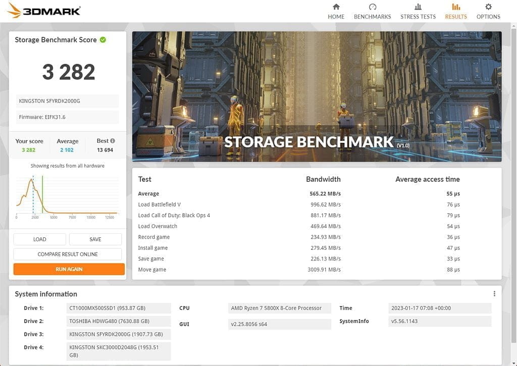 As you’d expect, there is not a massive difference in performance between this drive and the KC3000, but this drive does still load scenes a touch faster. There is quite a big difference between this and the older generation PCIe 3.0 KC2500.