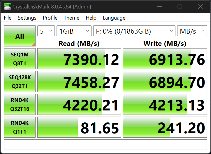 Crystal Disk Mark shows incredible performance, with the sequential read speeds exceeding the question speeds for the product specification. For read speeds, it is slightly faster than the KC3000, but the KC3000 significantly outperformed the product specification, which gives a hint that these are likely the same underlying hardware.