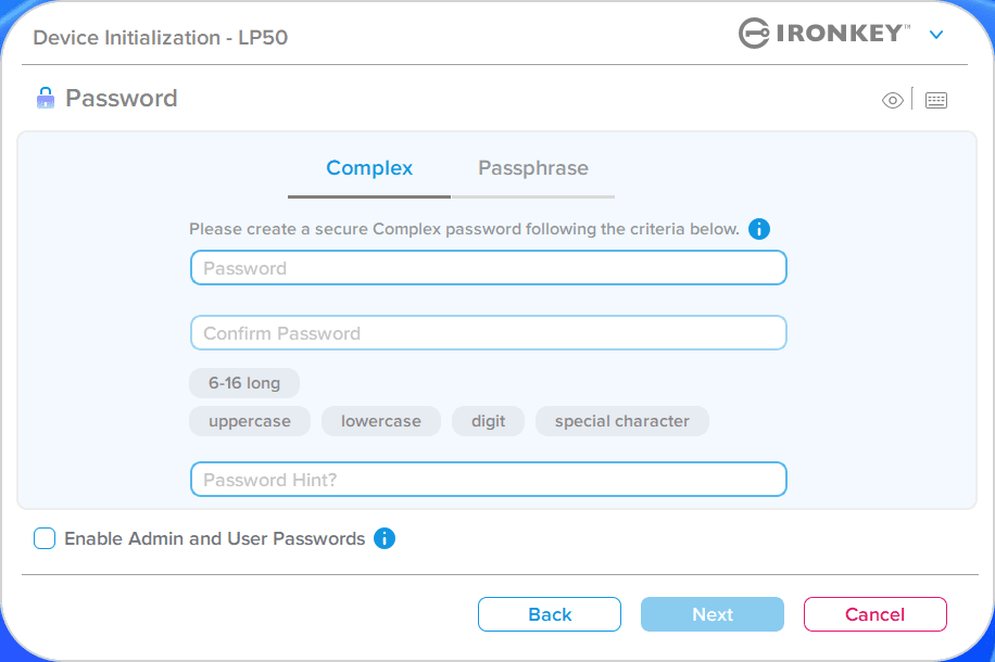 - Complex or Passphrase password modes