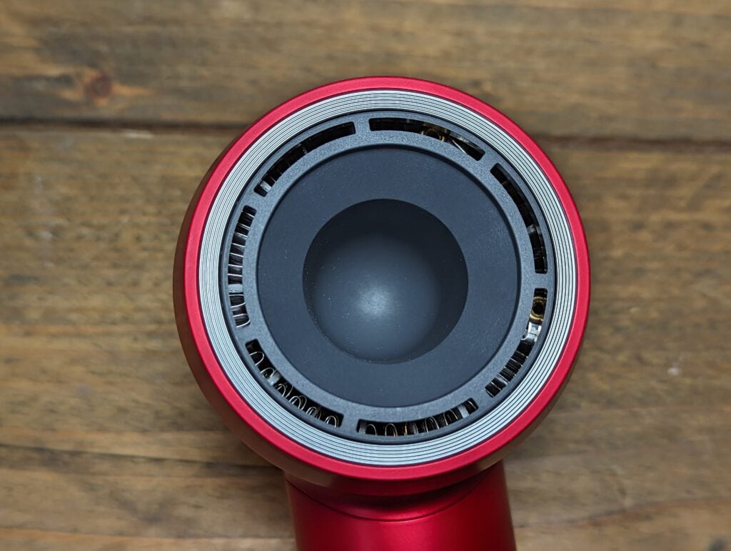 What helps reduce the size of the head is the airflow design. The hair dryer channels up through the base of the handle, which passes through a dust filter. You can easily remove the casing around the filter for easy maintenance.