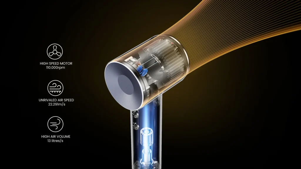 It aims to disrupt the premium end of the market, with its main competitor being the £330 Dyson Supersonic, thanks to its 1600W power with a 110,000 RPM brushless motor capable of producing 22.3m/s of airflow and producing 13 litres/s of air volume.