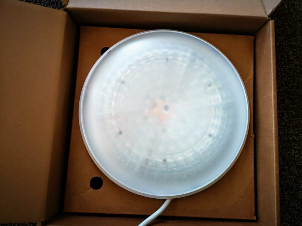 Its design is largely dictated by its functionality, with the lamp having a similar appearance to a UFO. It circular design has the down-facing LEDs section bulging out and with the large LED array clearly visible. The top of the lamp then has another smaller array of LEDs circling an attractive spiral design that leads up to the wiring. It certainly not ugly, and if you like a minimalist modern look this will probably be quite an attractive lamp for you.