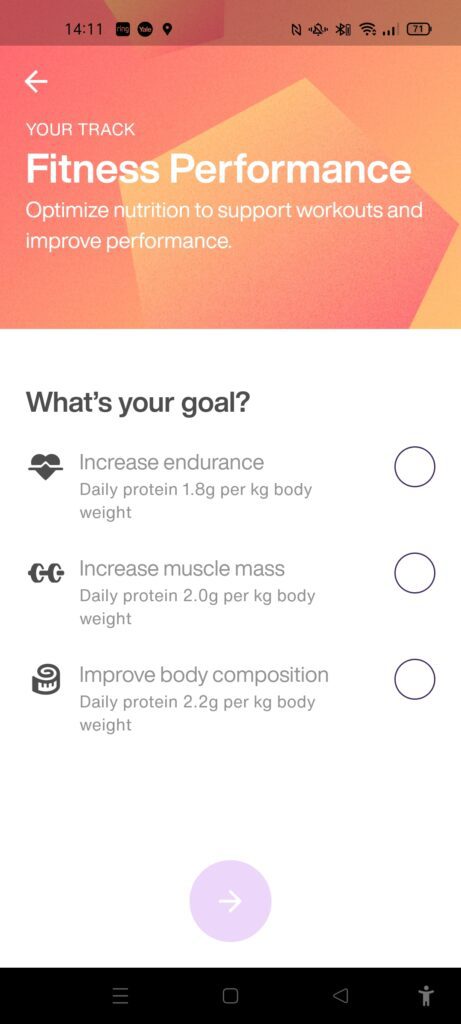 For my profile, I opted for fitness performance, and it looks like I selected the increased muscle mass option when it came down to protein (2g per Kg). Endurance probably would have been better at 1.8g per Kg.