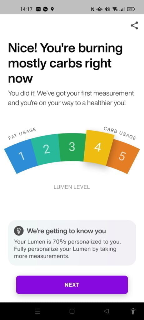 When you take a reading before exercise, the Lumen app will again provide you with some nutritional advice, saying how many servings of carbs you can have.