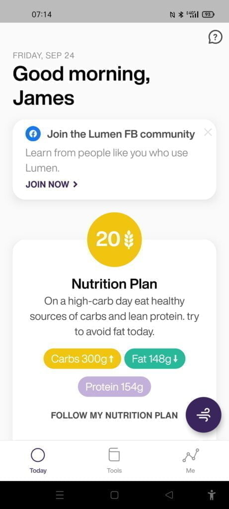 - Customised nutrition plan based on goals, your activities that day and your Lumen readings