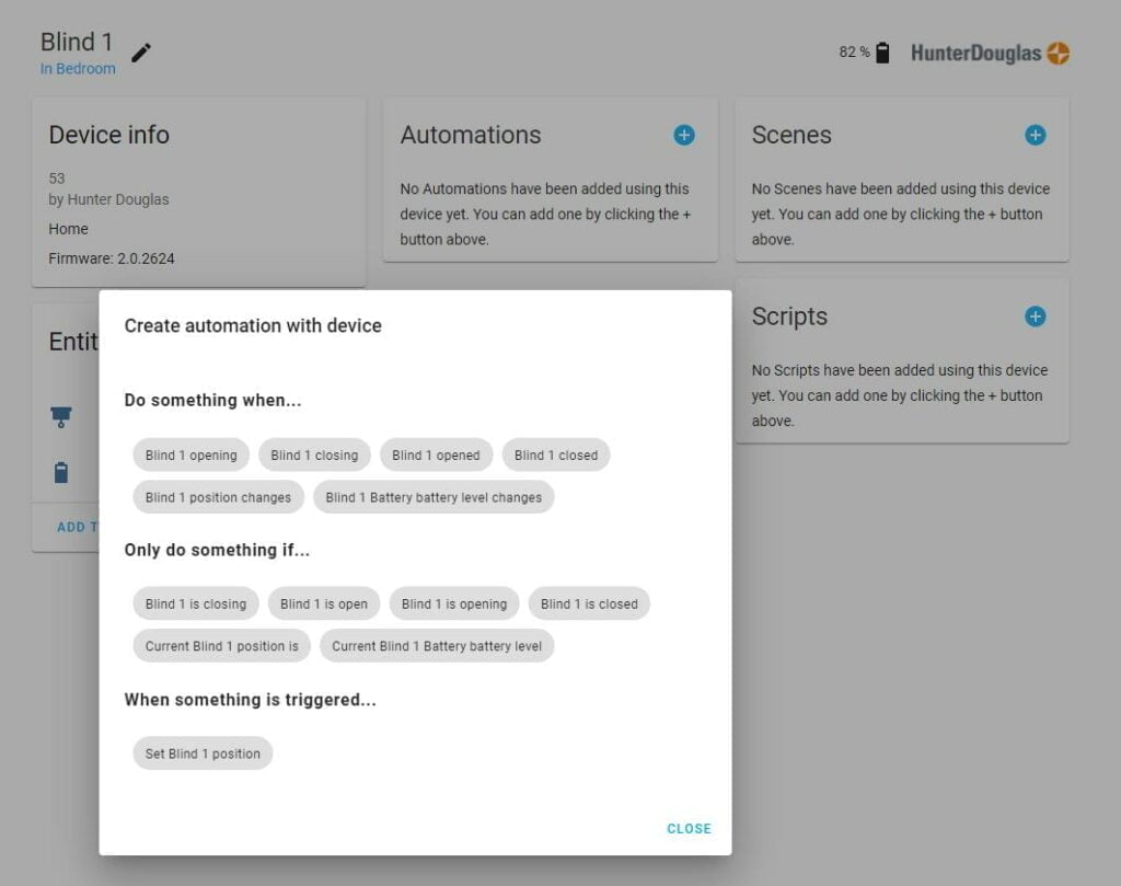 Home Assistant will then provide direct blind control and also import the scenes you have created.