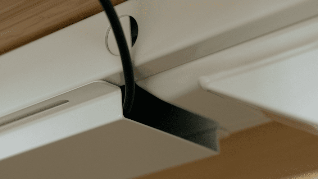 The table comes with sticky back cable ties but doesn’t really come with any cable management system for the user’s wires. Though advertised to include cable management, the cable passage is screwed to the underside of the table and is inaccessible once the assembly is complete.