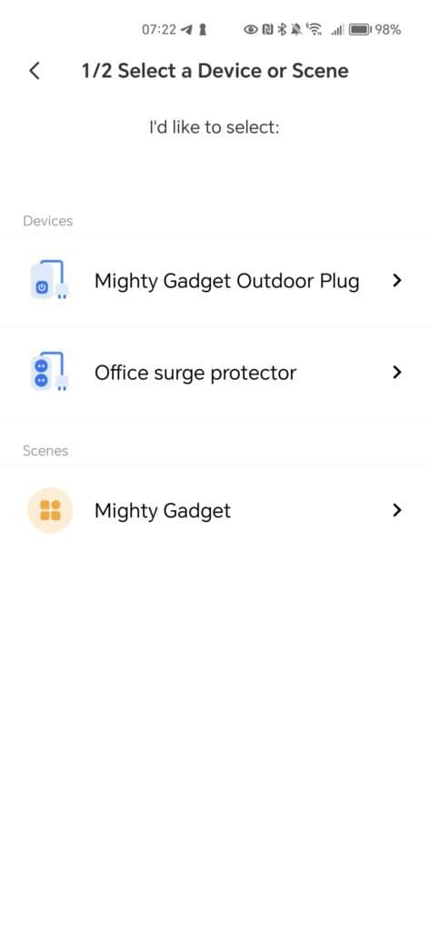 The app provides manual control as well as options for scenes, schedules, and device settings. However, some features like energy monitoring are hidden away in the settings rather than being prominently displayed.