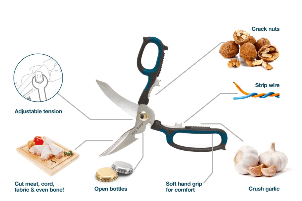 I am not sure what everyone else kitchen is like, but mine is a mess, I can never find what I need, scissors and bottle openers and anything small always goes missing, so the 5-in-1 Smart Scissors are an appealing gadget to myself. These 5-in-1 scissors combine a special cut anything blade that is curved for safety, a bottle opener, cruncher, nutcracker, wire stripper and bottle opener.While I don’t have much need for a wire stripper in the kitchen, I guess it is an added bonus. As a pair of kitchen scissors, they have been good, I mainly use them for cutting into packages, but also things like cutting off the fat on meat and other food prep related tasks. The scissors are not razer shape but they do comfortably cut through anything you want.You can never have too many bottle openers, so the addition of this is great.At just under £14 these make a good investment for any kitchen.[button link=”https://amzn.to/2LDRGFW”] Buy the AnySharp Scissors from Amazon[/button]