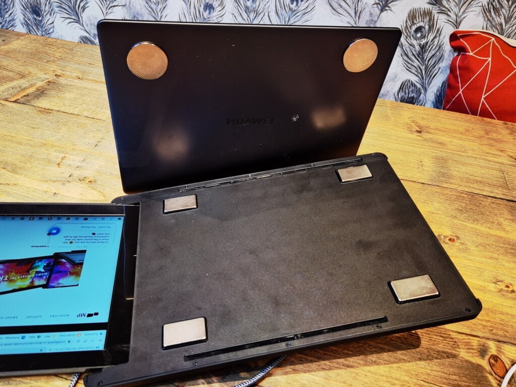 To mount the monitor, you need to physically stick metal disks onto the back of the display, with the case then having four magnets that attach to this. Admittedly this is an effective solution allowing you to mount and unmount quite easily, and I can’t think of a better solution. However, having four big disks attached to the back of an expensive laptop monitor is not really something I want, personally.