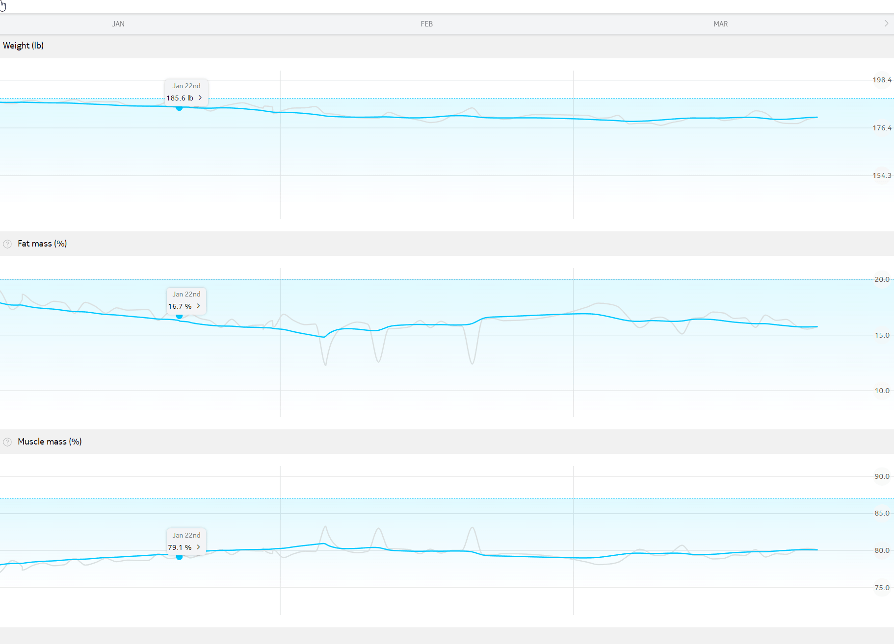 My first reading on the 22nd of January was 185.7lbs with a fat measurement of 16.7% with muscle mass of 79.1%On 22nd of March, I was 178.2lbs with a body fat measurement of 15.8% and muscle of 80%On paper, these look like good results assuming I made no changes to my diet, but in reality, this wasn’t the case, I didn’t drink until MWC at the end of February, and my diet was generally on point as I started marathon training. Things did go off course when I went to MWC at the end of February, and I had 4 unhealthy days, 3 of which I was unable to use Modius.
