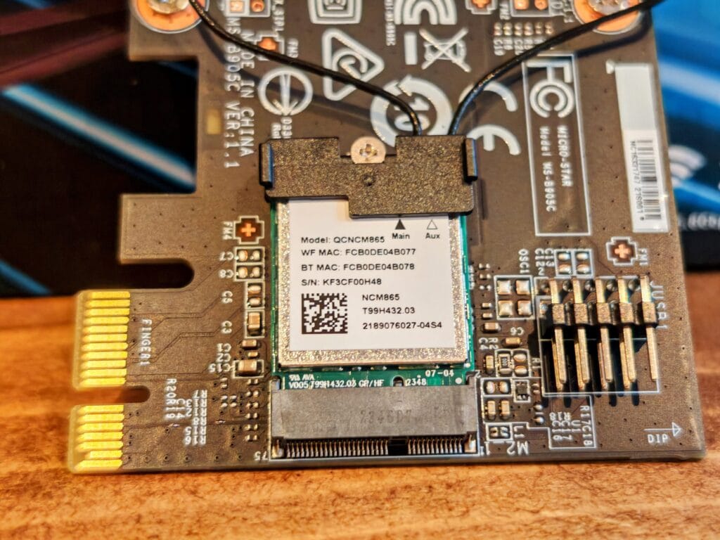 This is a PCIe adaptor that uses an x1 slot, and it has an external antenna. Beyond installing the card, you will need the drivers, which you can get from MSI.com. They also included a CD with the drivers on it which feels very retro.