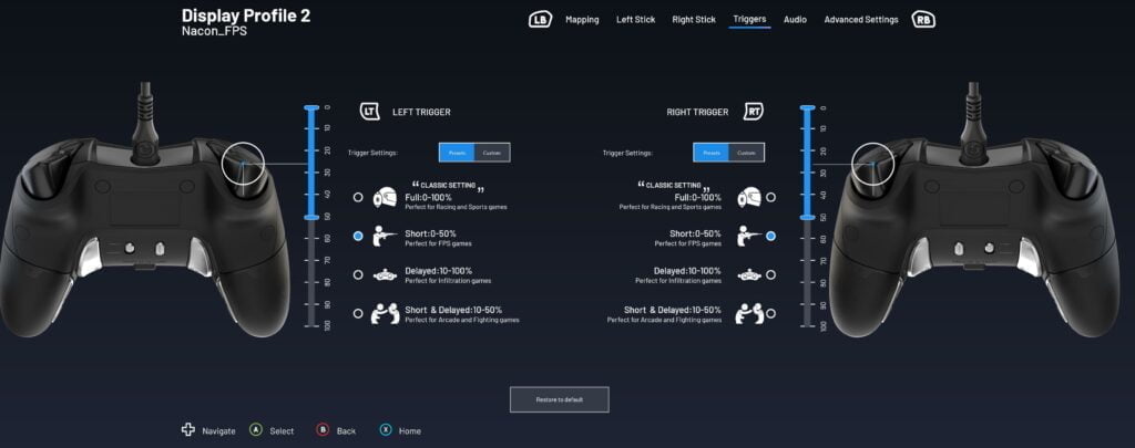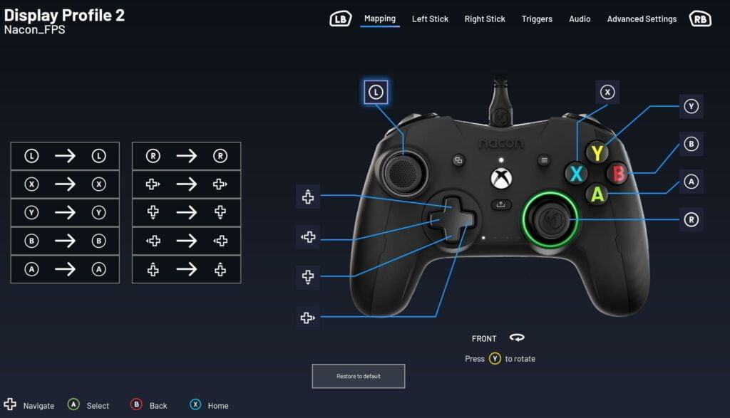 However, you will need the Revolution-X app to map the customisations to the controller. The various options available are almost identical to the Nacon Pro Compact. You can adjust trigger sensitivity, button mapping and the response curve of the analogue sticks. However, you now have 4 additional rear buttons you can customise, and you have some RGB elements you can also customise. This also has multiple profiles allowing you to customise a profile depending on the game you play, allowing you to switch during gaming without having to go back into the app and adjust everything.