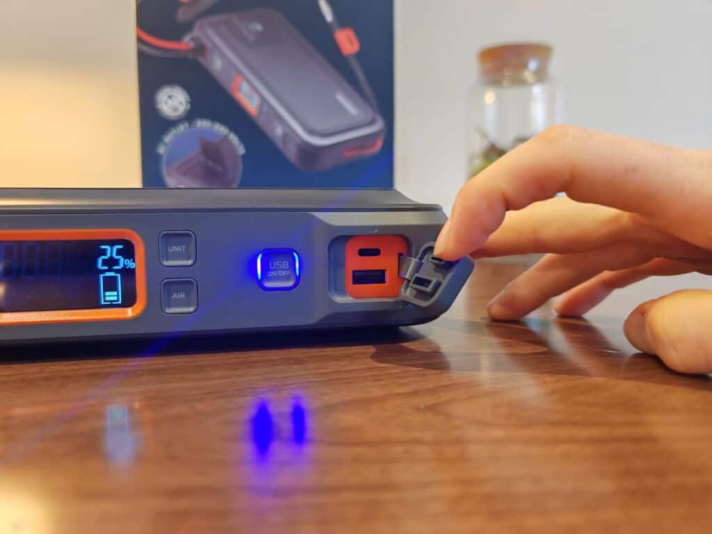 This is a multifaceted device that is perfect to keep in your car. It consists of a 96.2 watt-hours power bank and features a 130psi air compressor, 1500A jump start port, 220-240v AC outlet, USB-C/A ports, and a 3-mode flashlight.