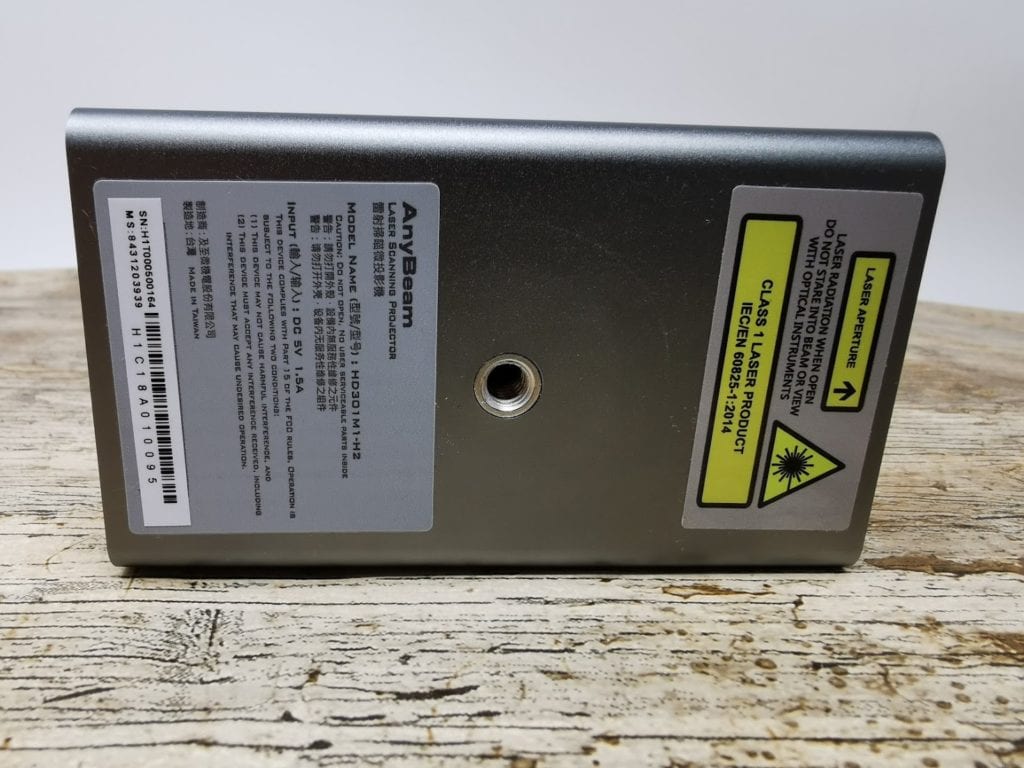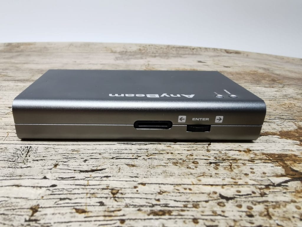 On one side of the AnyBeam is the small window for the laser, then on the rear is microUSB for power, HDMI and 3.5mm out. To the side there is volume control.