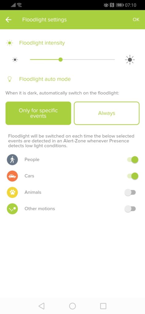You can then adjust the floodlight settings. With the smart object detection, this allows you to have it switch on when it sees a person or car, but ignore animals or other motion.