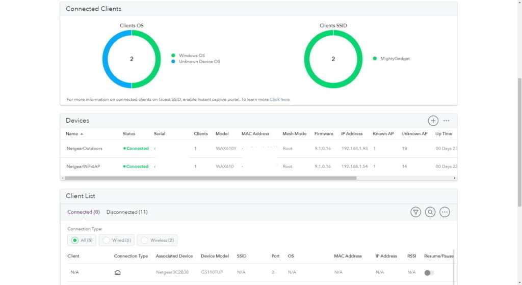 The Wireless tab offers an overview of your current Wi-Fi devices which includes the client list with details data about the client, its roaming history and the ability to pause its connection on the network.