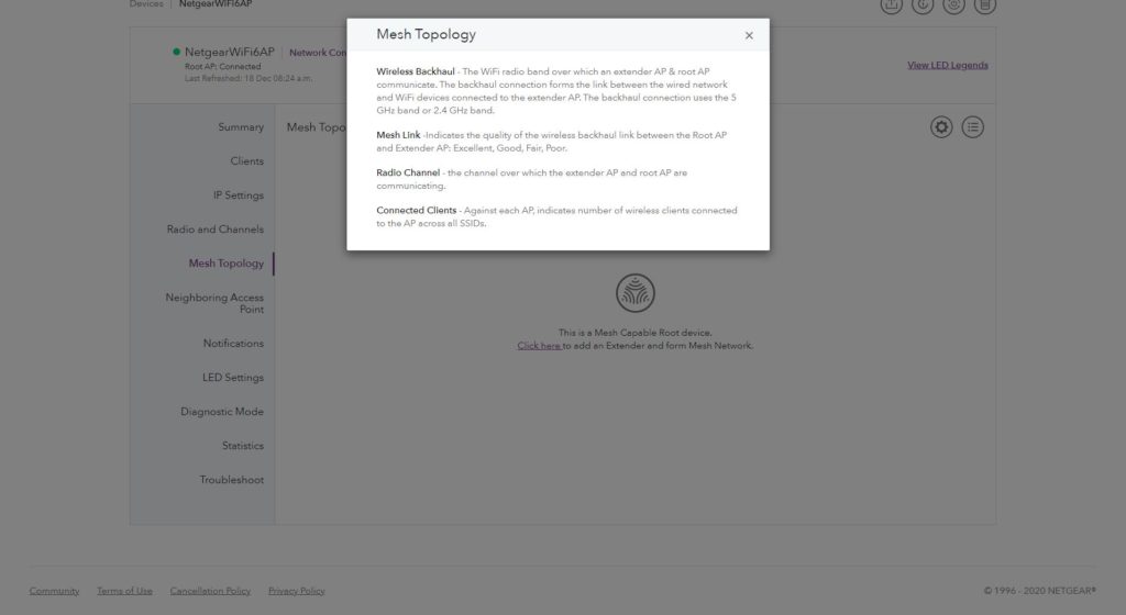 The main dashboard shows the mesh topology, so you can have a better understanding of which device is serving your mesh node.