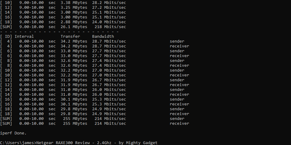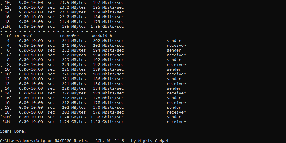 Eventually, I was able to connect at 2.4Gbps, and iPerf speeds were 1.47Gbits/sec, which was fractionally less than 5Ghz on 160Mhz.