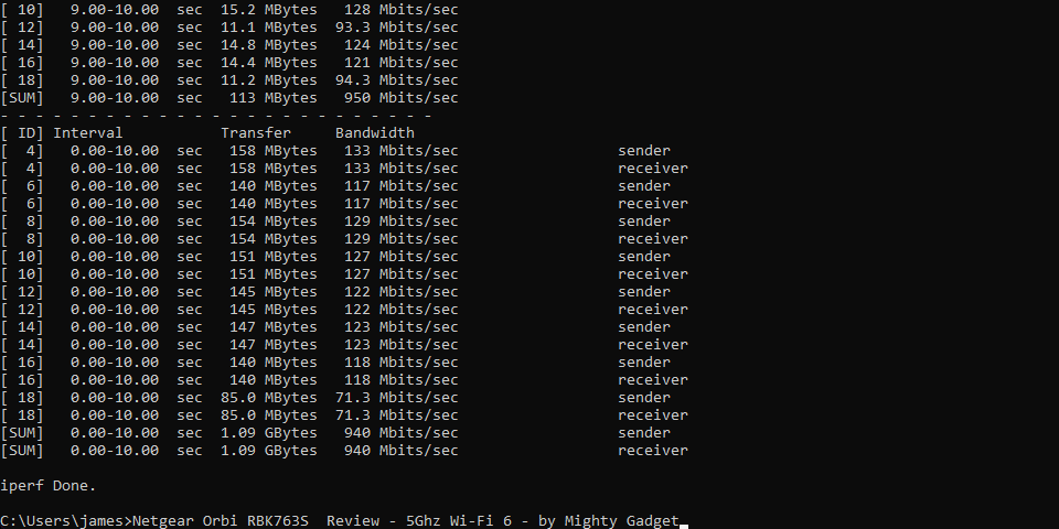 With WiFi 5, I managed 927 Mbits/sec. File transfer speeds were almost the same, with a throughput of 110MB/s.