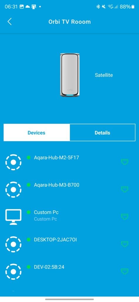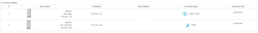 In the past, I have had issues getting a wired backhaul to work with Netgear Orbi; I don’t think it is Netgear’s fault exactly. I have haphazardly wired up my home, and everything runs through switches in my loft. I am fairly sure it was my Zyxel switches that were somehow interfering with the Orbi registering the wired connection. After experimenting with different switches, I finally got all the Orbi 970 series satellites working with a wired backhaul, albeit only on 2.5GbE, which is what my network is running on.