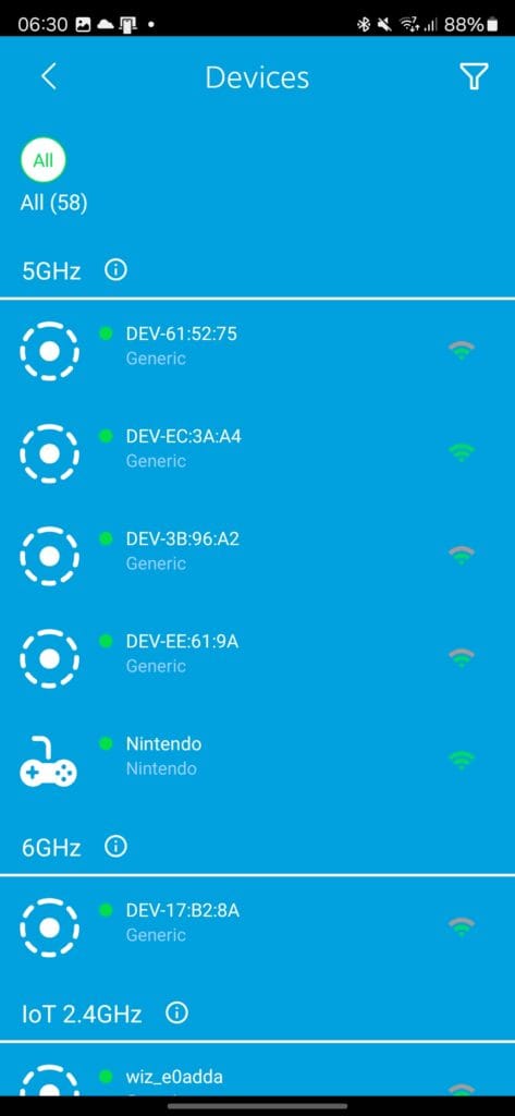During my tests, I observed that when the backhaul used the 6GHz and 5GHz bands, the client devices would connect to the 5GHz band. This is an intelligent design choice, as it allows the system to optimise performance by utilising the dedicated 5GHz band for client devices while reserving the 6GHz band and second 5GHz for the backhaul connection. If the 6GHz band was shared with backhaul and client devices, it would have incurred approximately a 50% reduction in throughput.