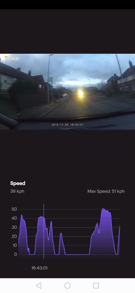 If you send the video footage to yourself all you get is the video with a time stamp. However, if you view the footage within the app it plays with the video below and a map of the route above, but no speed. However, you can then hit the full-screen button where you will be provided with the video on top and a speed graph below.