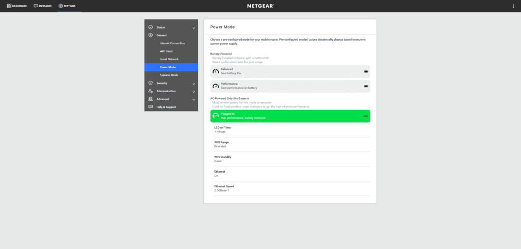 - Balanced – This is the default mode with the best battery life. In this mode, it works as a pure mobile hotspot. Its network port is disabled and set to 100Mbps (you can then toggle the Ethernet on)