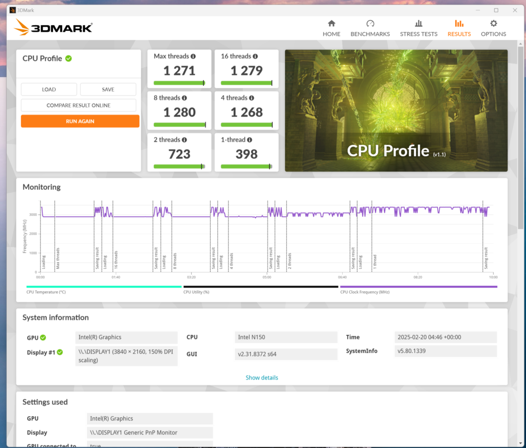 The Intel N150 processor scores modestly in CPU-intensive tasks, reflecting its position as a low-power chip.