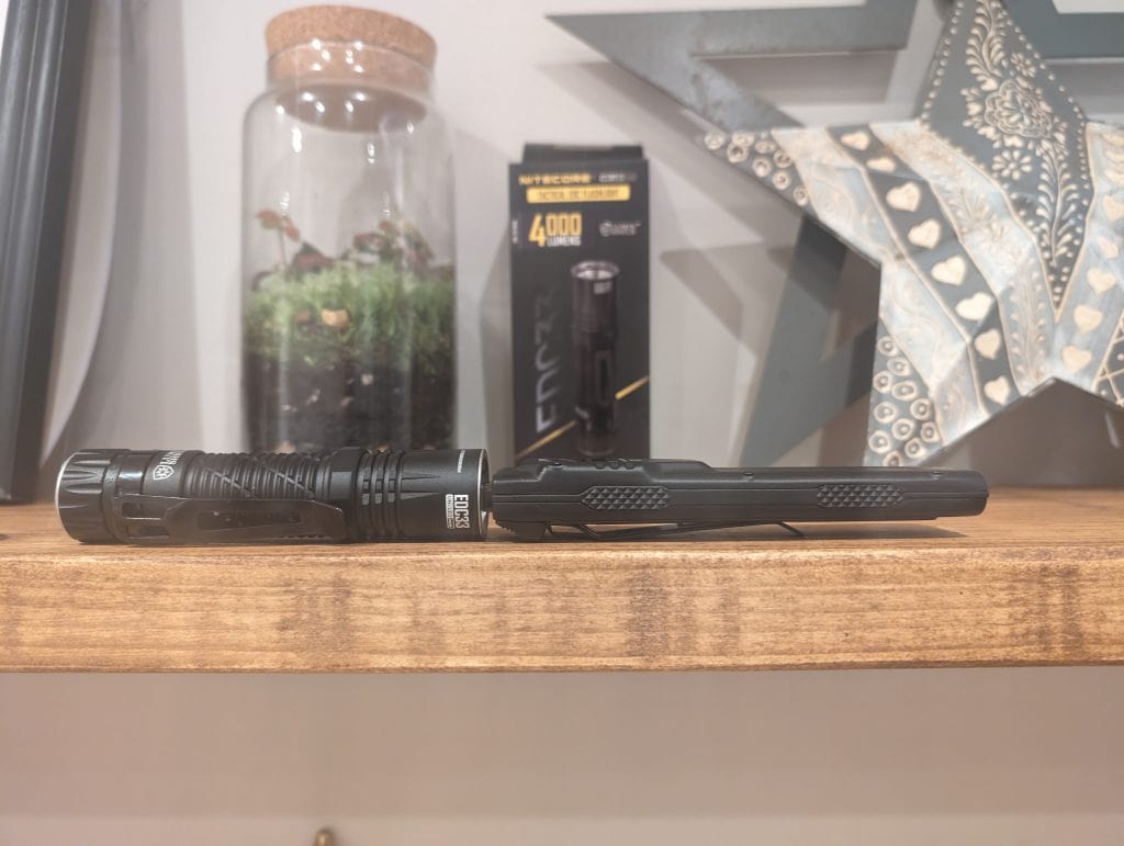 The EDC27 does have a different lighting pattern though, the light spread is consistent, so it is perhaps a better option for illuminating the area around you at close range. The flat design is also a bit more appealing for an EDC flashlight.
