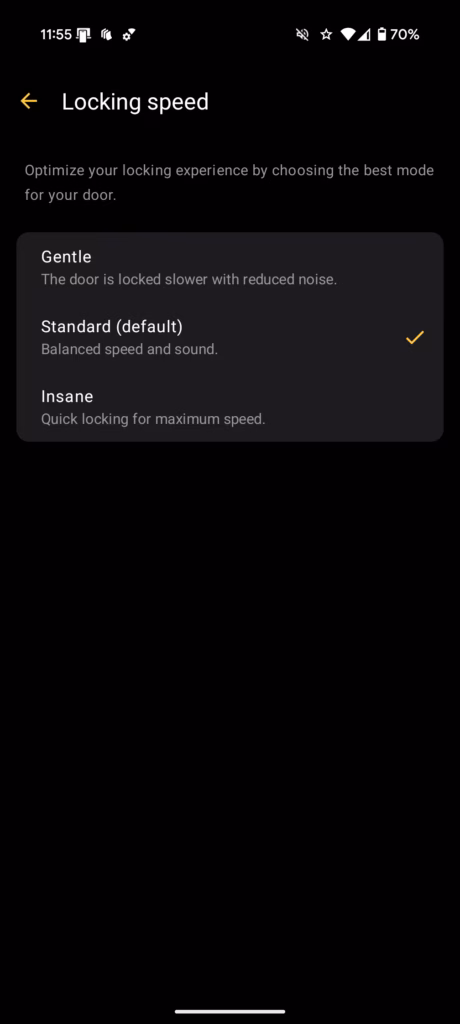 The Insane mode unlocks doors in under 1.5 seconds, making it one of the fastest smart locks available. The Standard mode provides balanced performance with reasonable noise levels, whilst the Gentle mode operates more quietly but takes longer to complete the locking cycle. The lock automatically adjusts between these modes based on time of day settings, switching to quieter operation during nighttime hours.