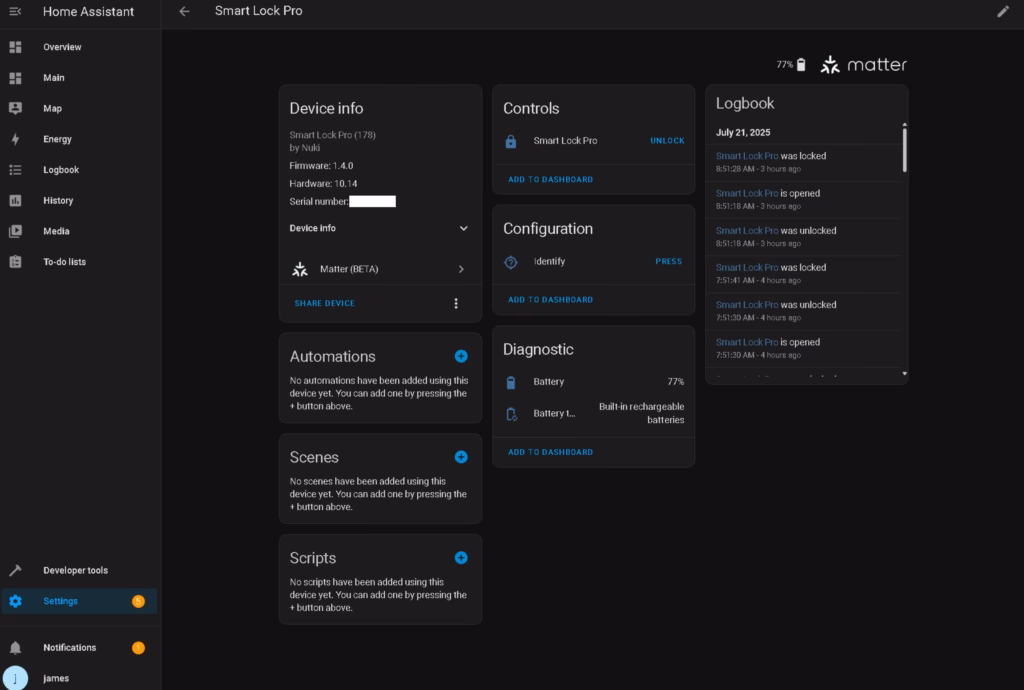 The available automations are limited; it is basically just lock and unlock. But, these are handy as you can trigger actions when someone enters or leaves. It is probably a limitation of Matter, but it would be good if the actual user details could be passed over. For example, if I used my PIN or fingerprint, it could trigger specific actions for me.