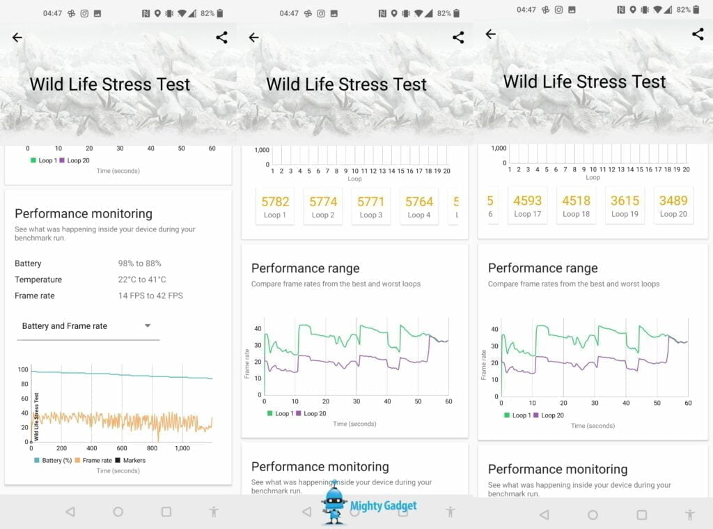 All this power comes at a cost; the SD888 chipset is power-hungry and runs hot. Testing this with the 3Dmark Wild Life Stress Test saw a significant deterioration in performance over the 20 mins of testing.