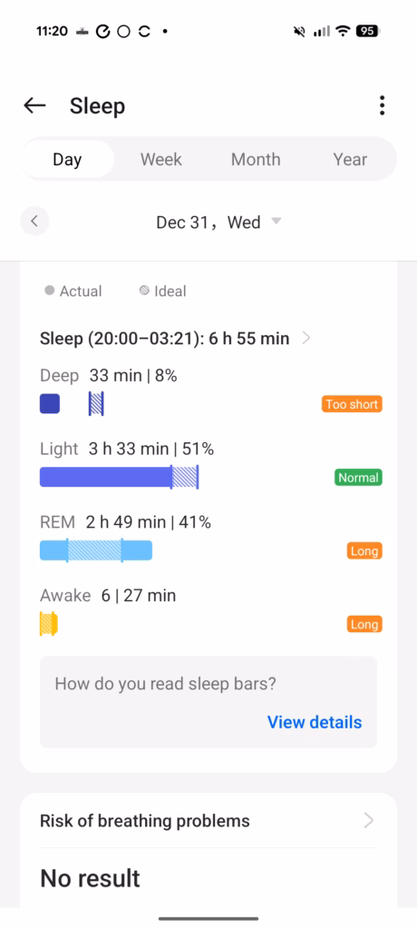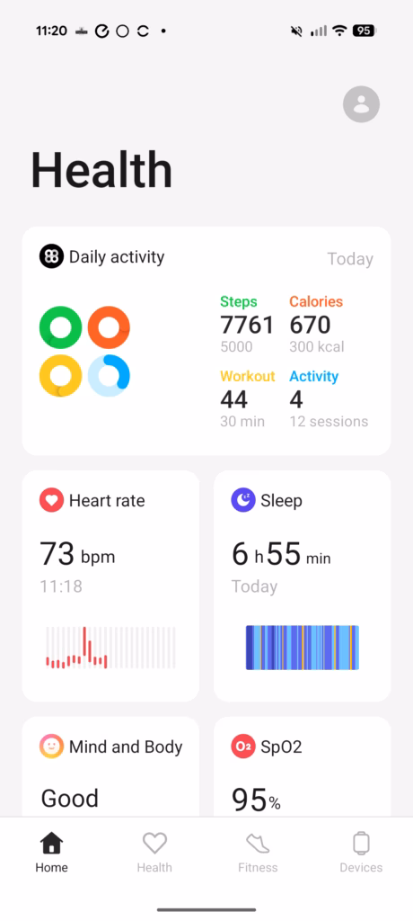 Sleep tracking captures total sleep time, sleep stages, and provides a sleep score. However, I found the sleep analysis to be somewhat basic compared to dedicated sleep trackers. While it accurately recorded when I fell asleep and woke up, the breakdown of sleep stages felt less detailed than what you might get from a Whoop or Garmin device. The OHealth app also lacks the personalised sleep improvement recommendations that have become common on competing platforms.
