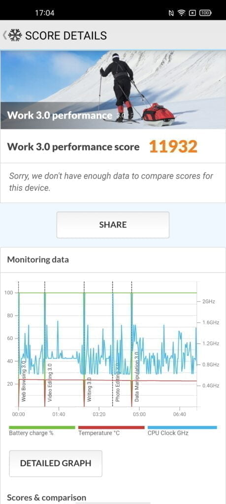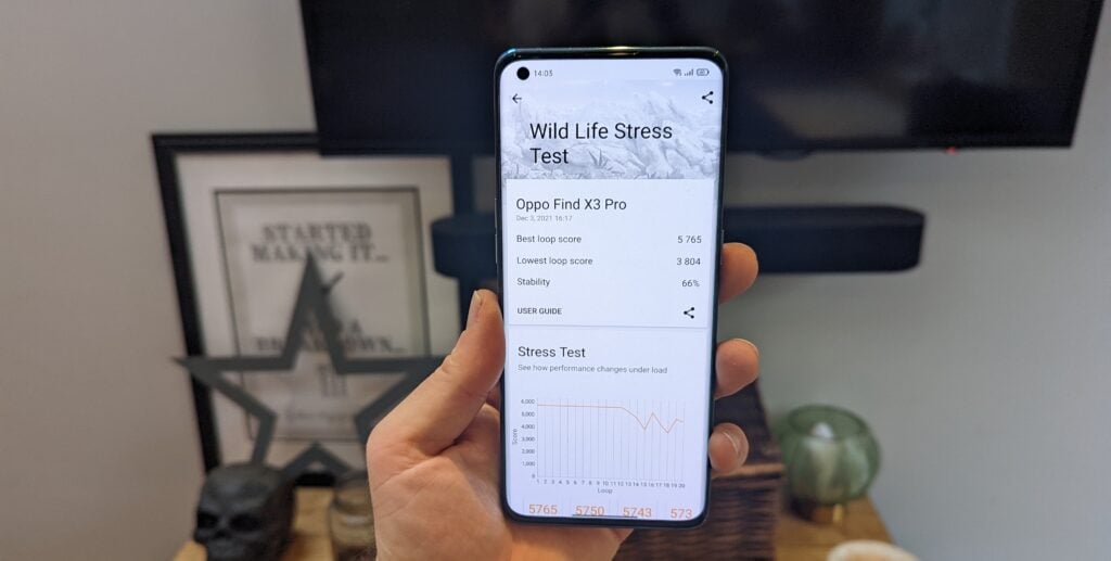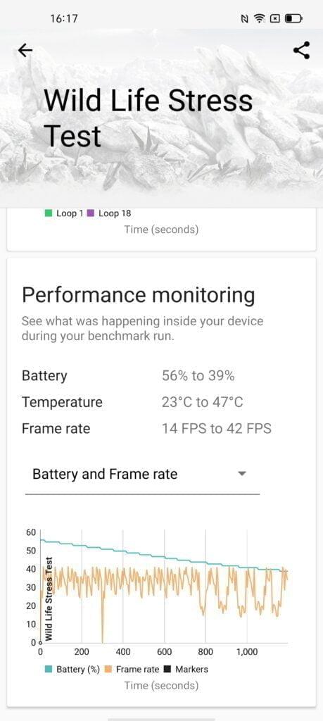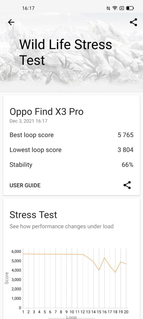 The Wild Life Stress test shows a stability score of 66%, with the scores taking a tumble at around the 12-minute mark. This is better than most devices this year, including the OnePlus 9 Pro and Samsung Galaxy S21. It is significantly better than the Realme GT and more recently, the Pixel 6 Pro which uses the Google Tensor chipset. It is only the Xiaomi Mi 11 and RedMagic phones that have better stability.