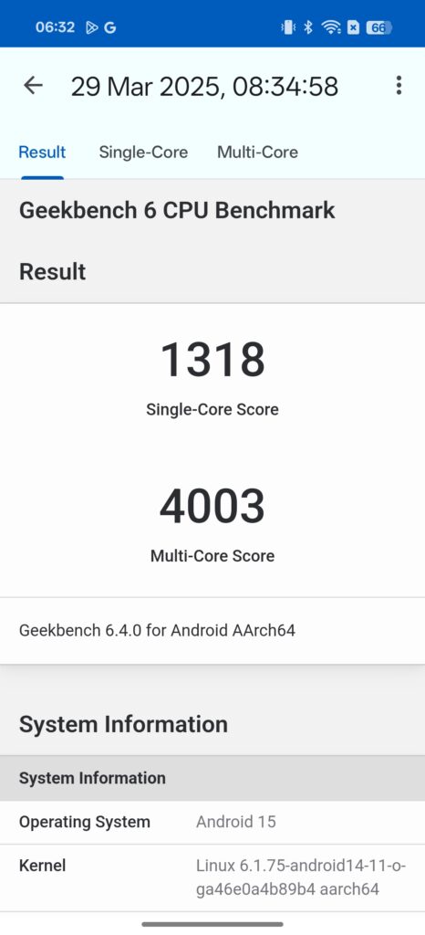 - GeekBench 6: 1,318 (single-core) and 4,003 (multi-core)
