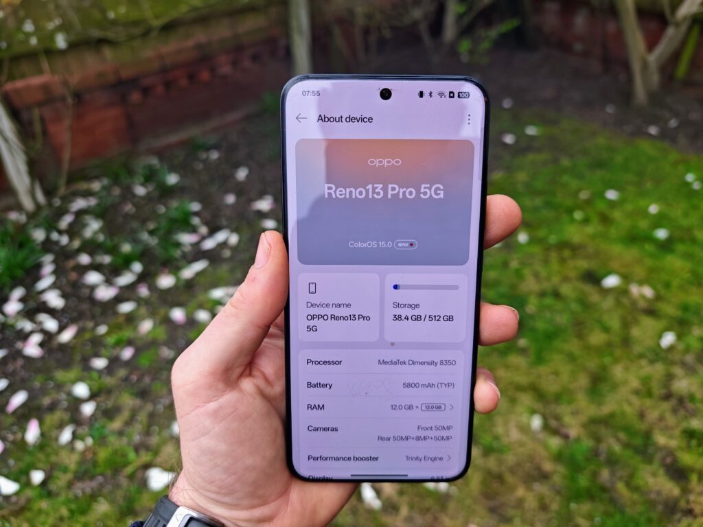The Reno13 Pro 5G is powered by MediaTek’s Dimensity 8350 chipset, paired with 12GB of LPDDR5X RAM and 512GB of UFS 3.1 storage. This represents an upgrade from the Dimensity 7300 found in the Reno12 Pro, though it remains firmly in mid-range territory rather than competing with flagship processors.