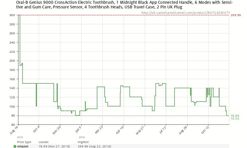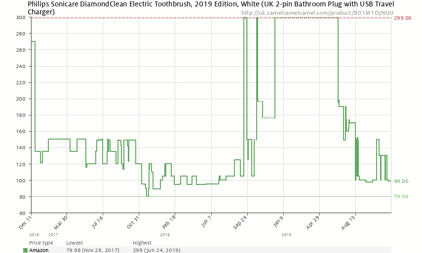 If we look at the Philips Sonicare DiamondClean on CamelCamelCamel we can see that it does sell for £299.00 for a chunk of the year, but from August through to October it was closer to its current sale price of £100.