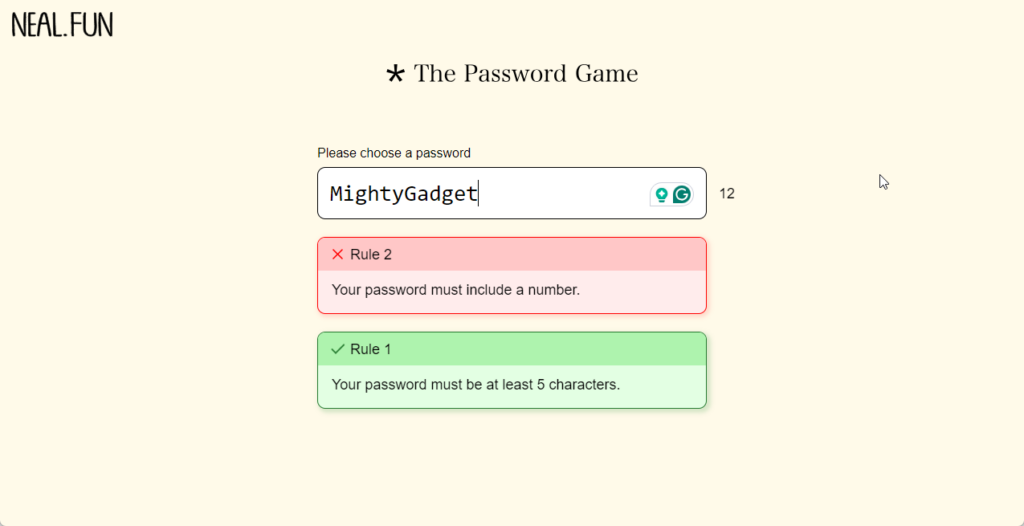 - Starting the Game: You start with a simple password and a basic rule. For example, the first rule might be to include a lowercase letter.