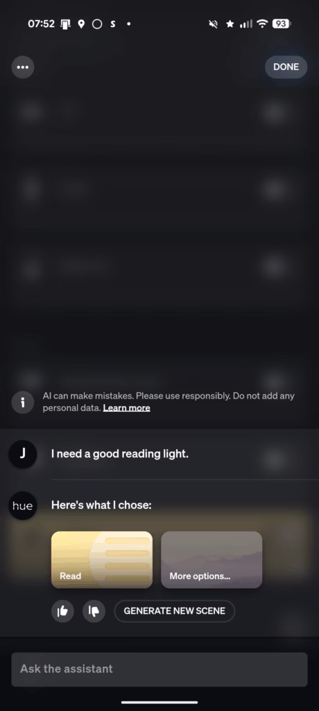 Fourth is the integration of an AI-powered assistant within the Hue app. This feature, which is still in its early stages, allows users to type or speak natural language commands to create scenes or, in theory, automations.
