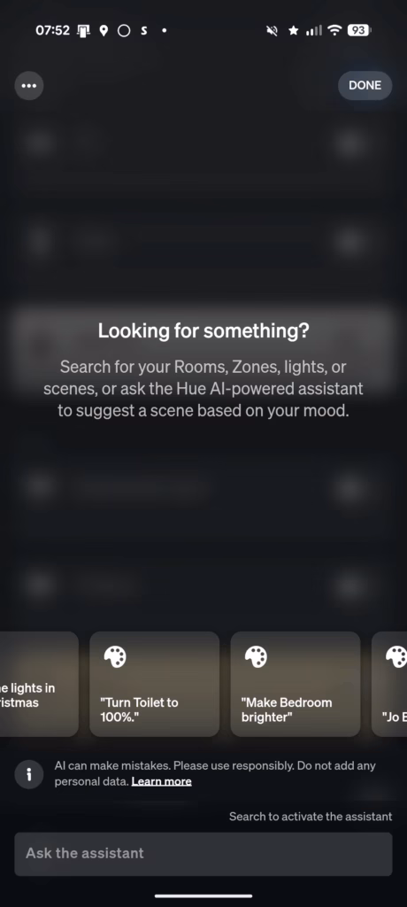 When you open the AI assistant, it presents sample questions that are surprisingly basic – things like “turn my bedroom lights blue” or “dim the living room lights to 50%”. These are all tasks that can be accomplished just as quickly, if not faster, using the regular app interface or voice assistants. The AI doesn’t seem to understand complex requests or multi-step automations that would actually benefit from natural language processing.