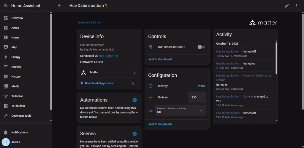 Setting up Matter requires scanning the QR code on the bottom of the bridge with your phone’s camera. The Home Assistant app immediately recognised it as a Matter device and began the import process. Within minutes, all my lights appeared in Home Assistant with their correct names, room assignments, and capabilities intact.